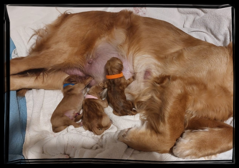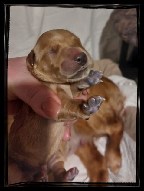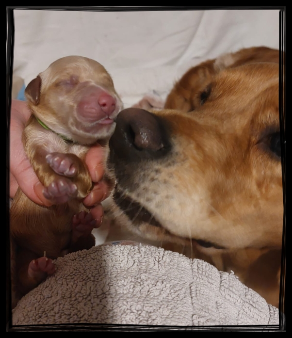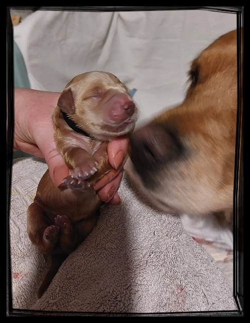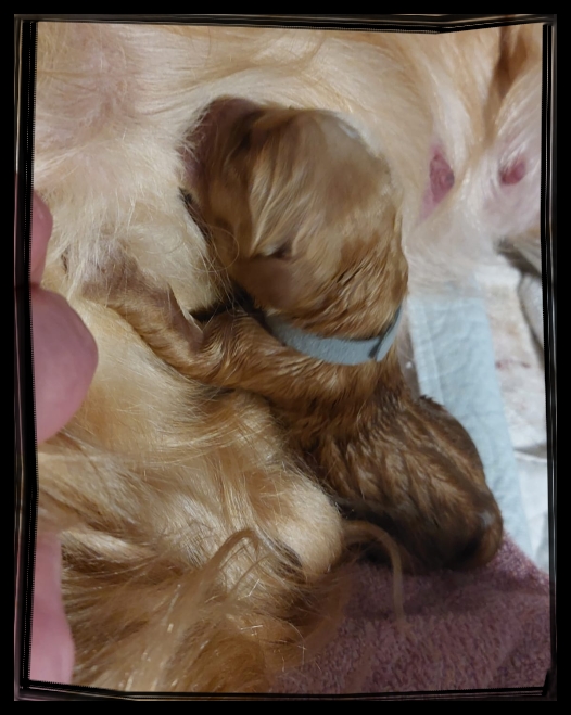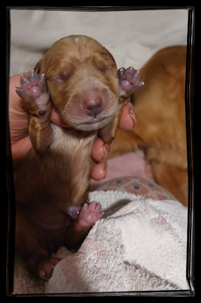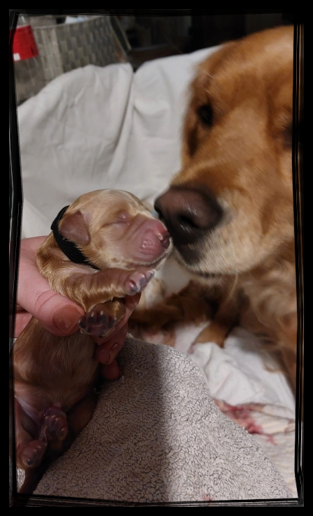 2. Welpe: Hündin, rosa Halsbändchen, 22.30 Uhr mit 430 g, golden