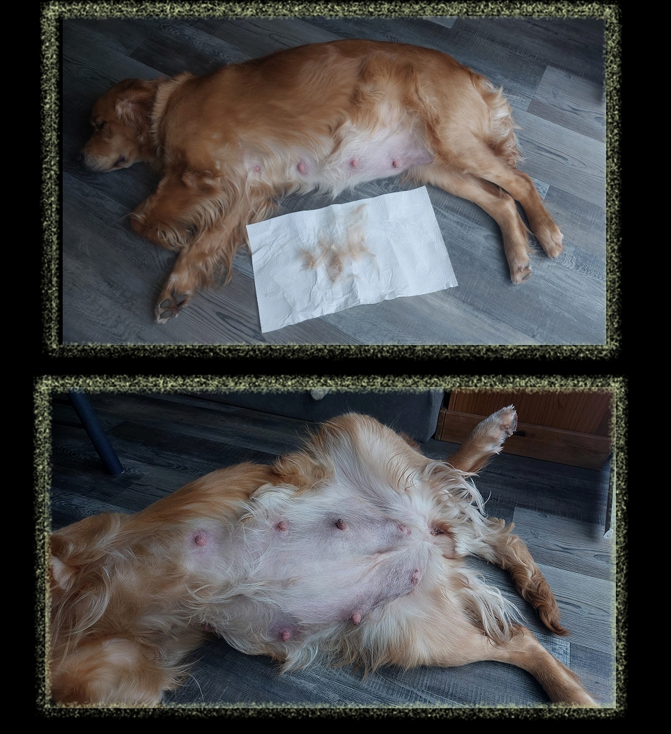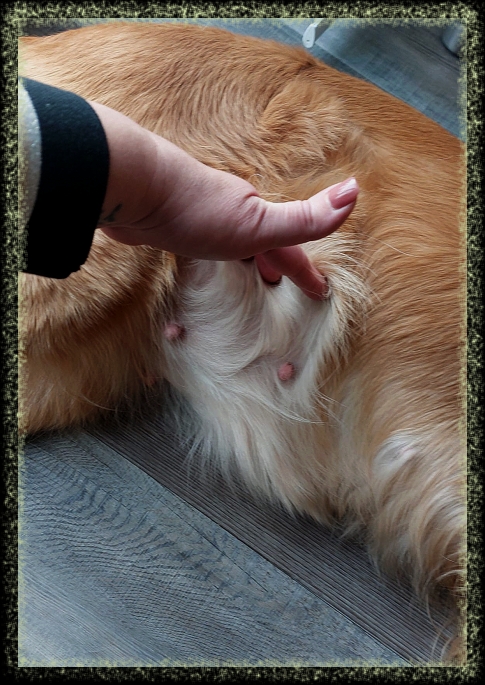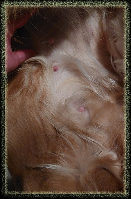 57. Trächtigkeitstag Ein klein wenig Fell musste leider weichen, damit sich ihre künftige Kinderschar an ihrer Milchbar bedienen können ;) Ihre Zitzen sind schon schon groß, und wir haben sie von Dreck und Schmutz gereinigt... Sie hatte schon den Milcheinschuß, es kommt schon Milch!