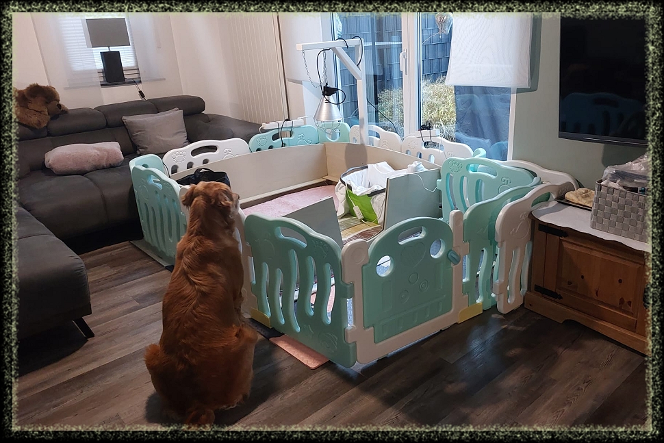 45. Trächtigkeitstag So langsam beginnen meine Vorbereitungen. Zunächst haben wir im Wohnzimmer am Treppenaufgang ein Treppengitter angebracht, dass Yuma nicht so oft unbeaufsichtigt hoch und runter läuft...