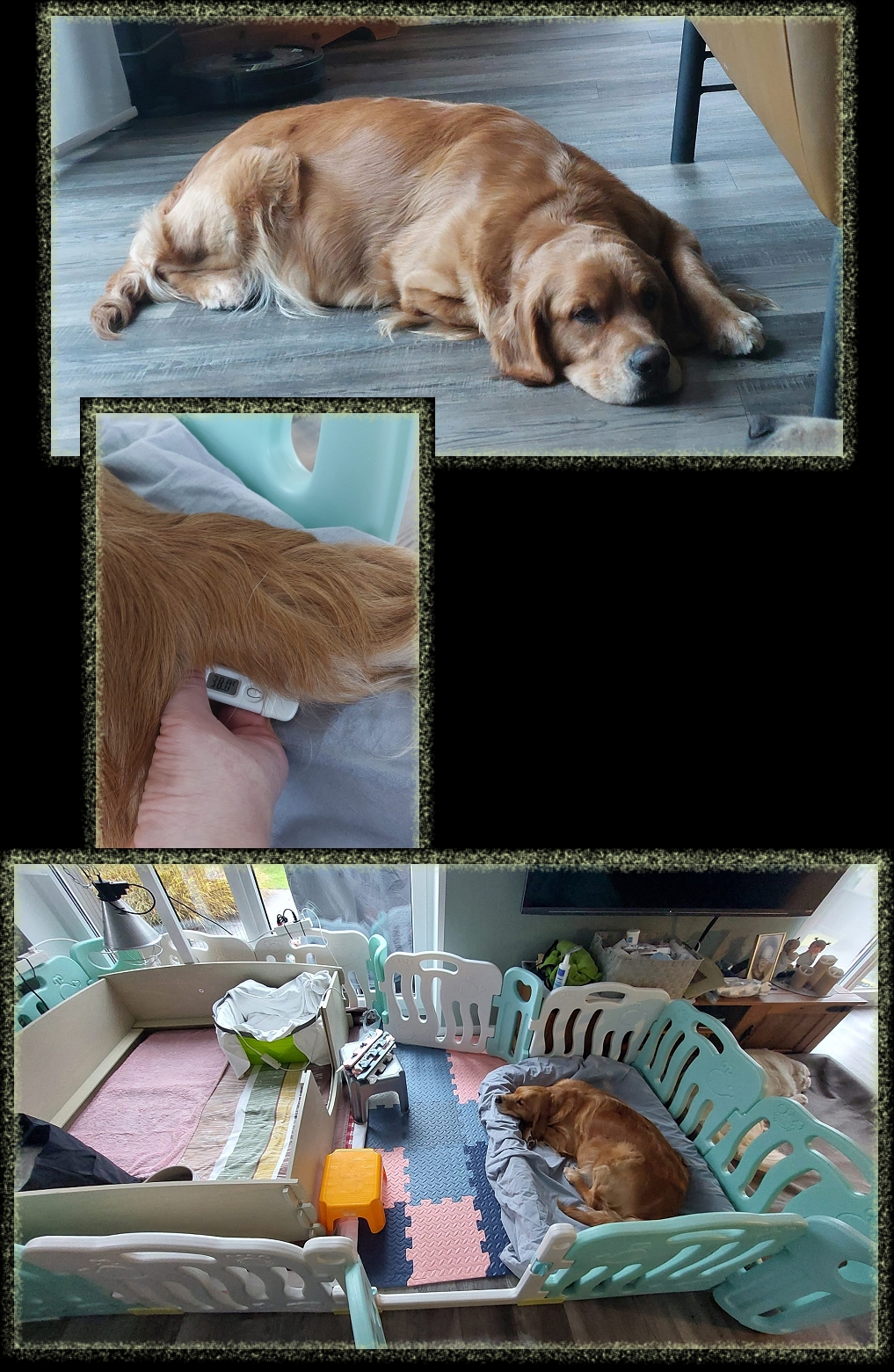 ... den Auslauf haben wir jetzt erweitert und gewöhnen Yuma daran. Regelmäßig am Tag legen wir uns zusammen in das Körbchen und streicheln ihren Bauch... sie genießt es! Die Temperaturkontrolle ist auch kein Problem für sie. Wir müssen den Temperaturabfall um mindestens 1 Grad notieren, denn dann beginnt binnen der nächsten 24 Stunden die Eröffnungsphase der Geburt....