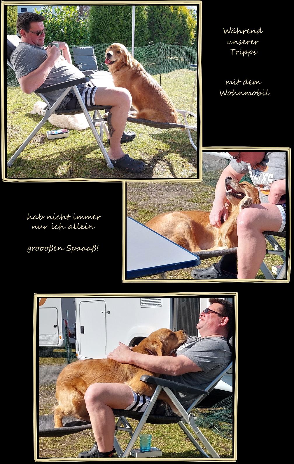 Die meisten Fotos machen wir wohl tatsächlich, wenn wir mit unserem Wohnmobil unterwegs sind... Also... nicht, dass es den Anschein erweckt, unsere Hunde seien ihr Leben lang draußen immer nur in einem Hundeauslauf...: Wir zäunen vor dem Wohnmobil immer ein Stück ein, damit die Zwei sich frei bewegen können, statt angeleint sein zu müssen