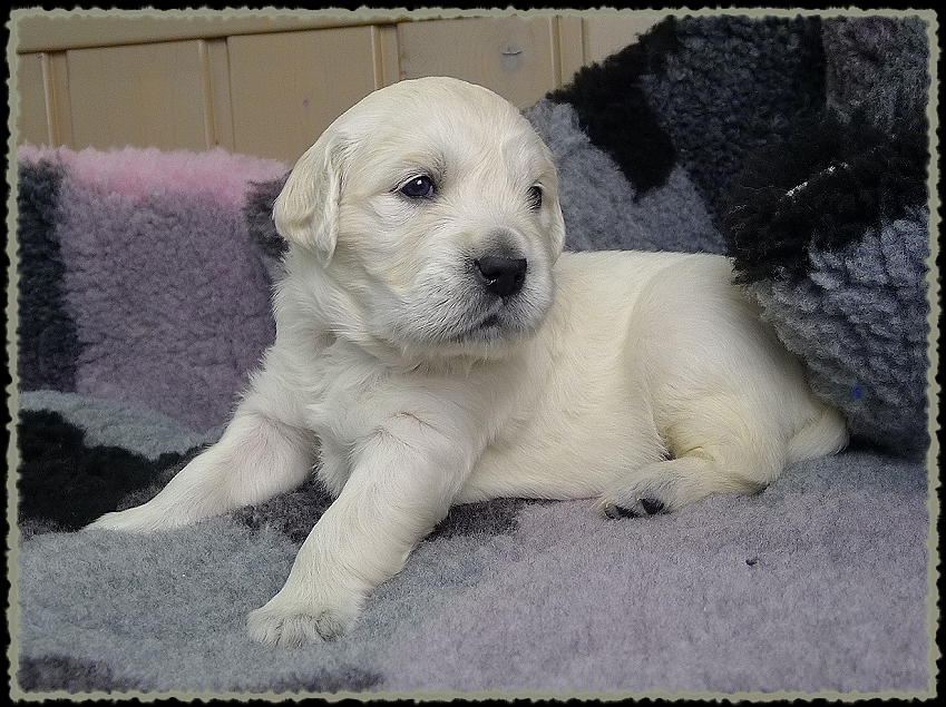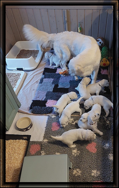 4. Woche Meine süßen Wonneproppen wiegen zum Ende der 4. Woche mittlerweile durchschnittlich 2450 Gramm und sind ganz schön propper ;) Bis dato bekamen sie meine Milch und Futter von Frauchen aus der Hand, damit wir genau wussten, wer wieviel gefressen hat. Aber jetzt sind sie auch soweit, dass sie selbstständig aus dem Napf fressen. Frauchen möchte noch nicht drauf verzichten, sie nachts oben neben ihrem Bett zu haben, obwohl es dort ein bisschen eng wird. (Das geht nur, da meine klugen Kinder das Welpenklo dort sehr gut benutzen) Abends, während des Fernsehens, liegt Frauchen im Bett und schmust abwechselnd mit ihnen. Spätabends darf ich noch mal säugen, und ansonsten bekomme ich neuerdings sonen Anzug an, damit sie nicht an die Zitzen kommen und ich langsam abstillen kann. Im großen Wohn/ Eßzimmer mussten die Eßzimmermöbel dem großen Auslauf weichen, da könnt ihr gespannt sein auf die nächste Lebenswoche!