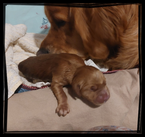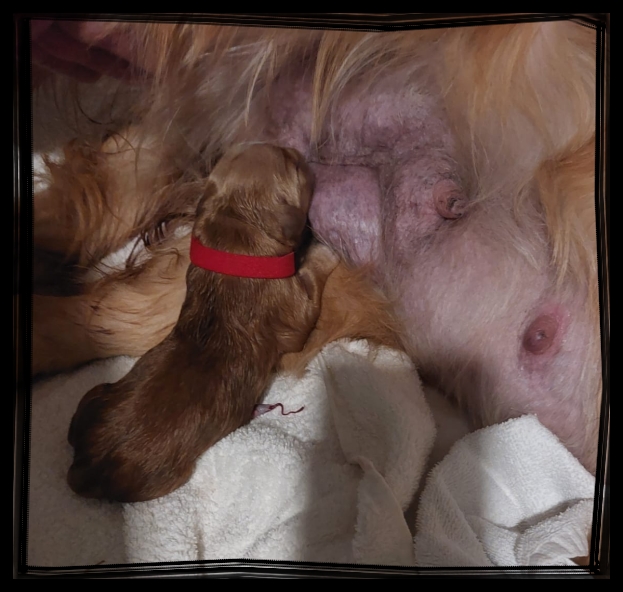 6. Welpe: Rüde, rotes Halsbändchen, 0.05 Uhr mit 460 g, golden