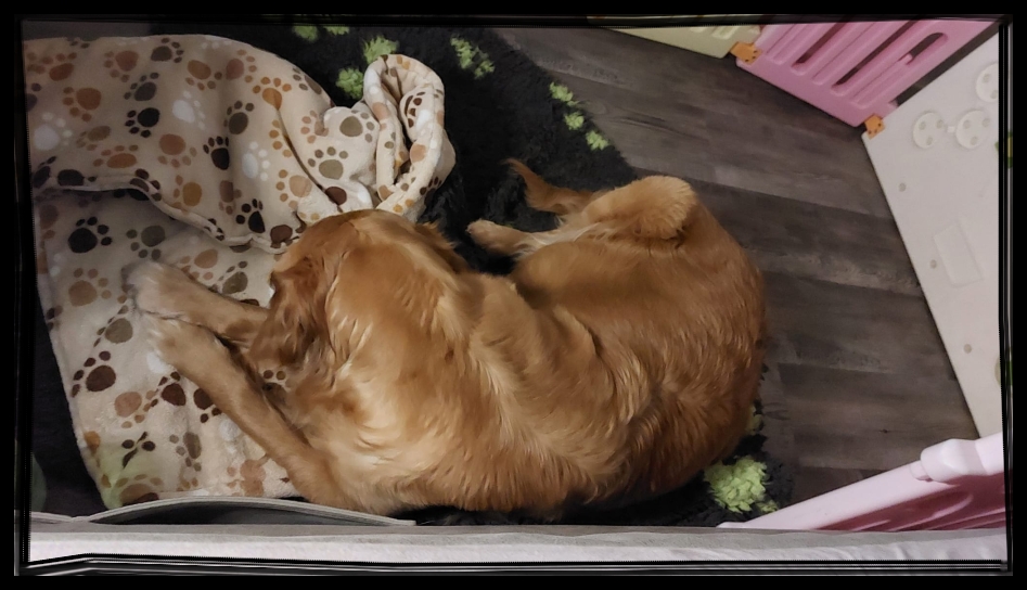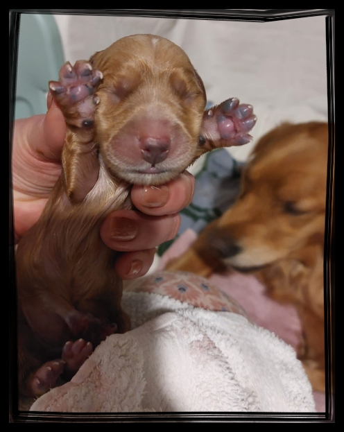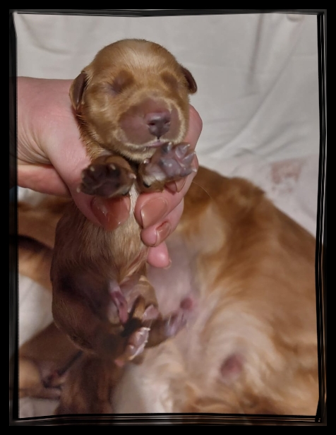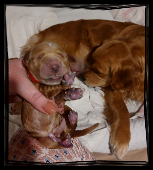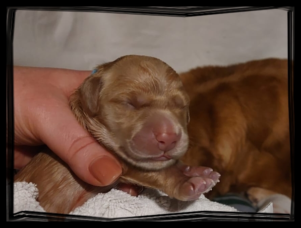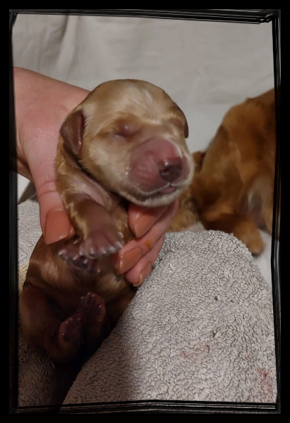 2. Welpe: Hündin, rosa Halsbändchen, 22.30 Uhr mit 430 g, golden