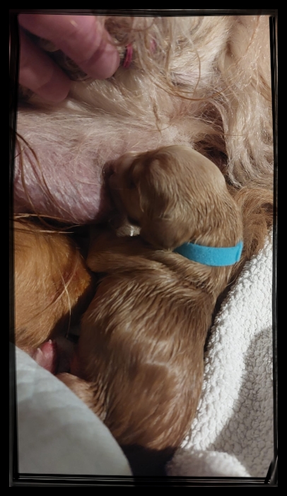 7. Welpe: Rüde, hellblaues Halsbändchen, 0.55 Uhr mit 480 g,