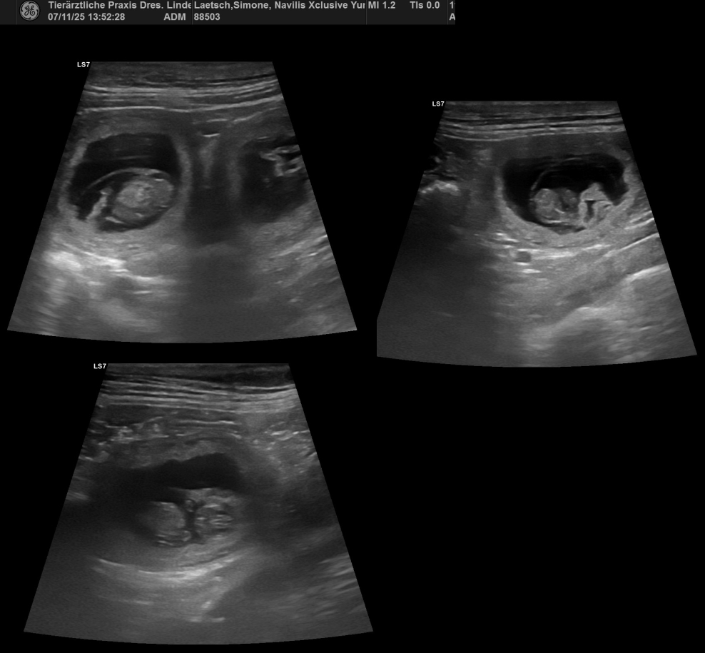 Am 28. Trächtigkeitstag war es dann endlich so weit. Wir haben eine Menge kleiner Kind of Magics gesehen!!!!!!!! *freu!!* Auch wenn ich mir schon im Vorfeld zu 99 Prozent sicher war, dass Yuma Babys erwartet, verzichte ich nicht auf den Ultraschall. Yuma macht das ganz easy, hat keine Angst davor, und ich kann mir relativ sicher sein, dass es nicht nur 1, 2 oder 3 Babys sind, was eher zu Komplikationen bei der Geburt führen kann, als wenn eine "normale" Wurfgröße zu erwarten ist....
