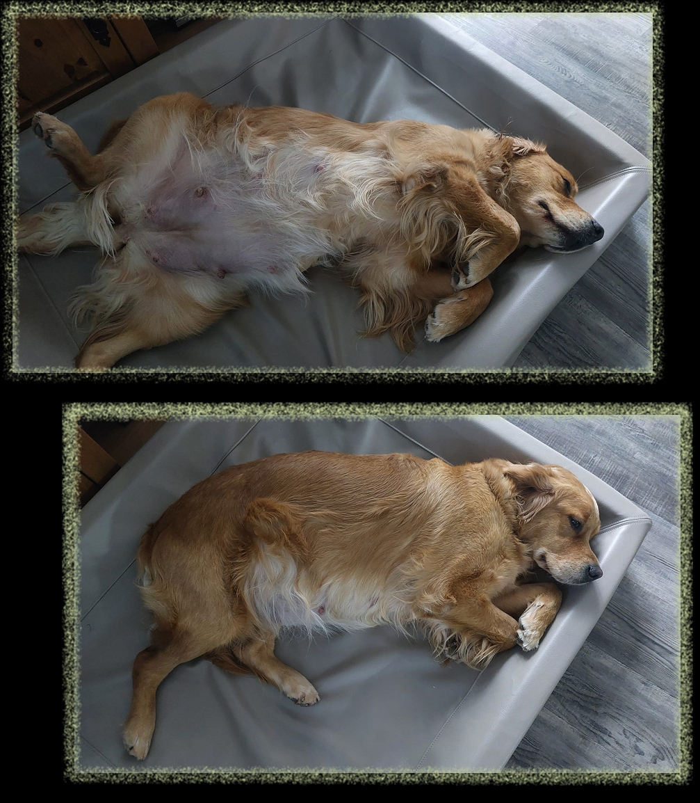 Am 46. Tag - das ist wahnsinnig früh und ich konnte es selbst erst nicht glauben, habe ich erste Welpenbewegungen fühlen können...! So früh war es noch nie zu spüren! Das ist immer ein gaanz besoonderer Zeitpunkt! Die Waage sagt 37,7, das bedeutet eine Zunahme von 6 Kilo seit ihrer Hochzeit! Das ist schon ganz schön... Allmählich wird alles schwerfälliger... das Laufen, das Aufstehen....