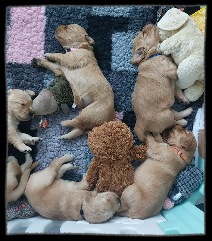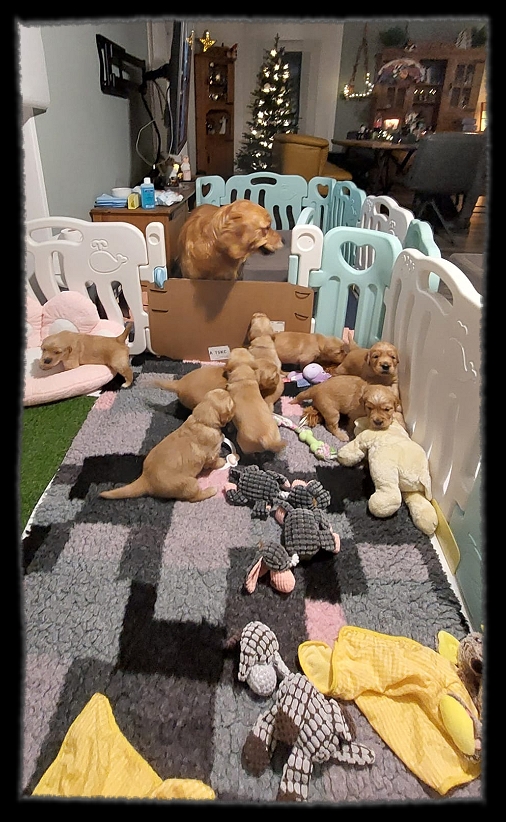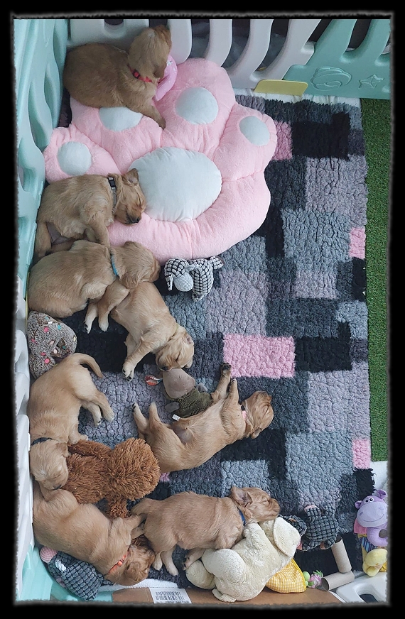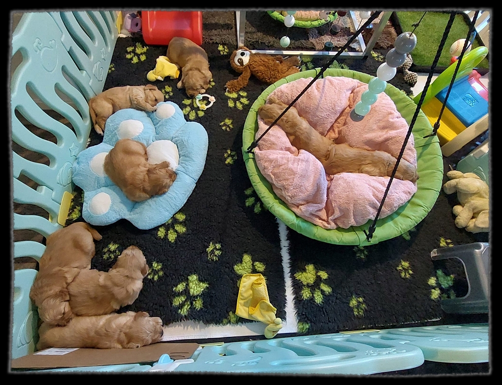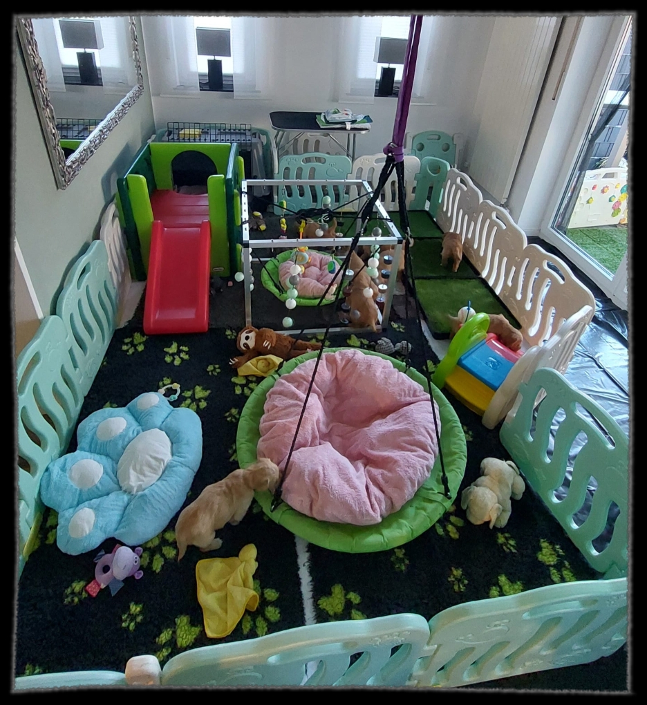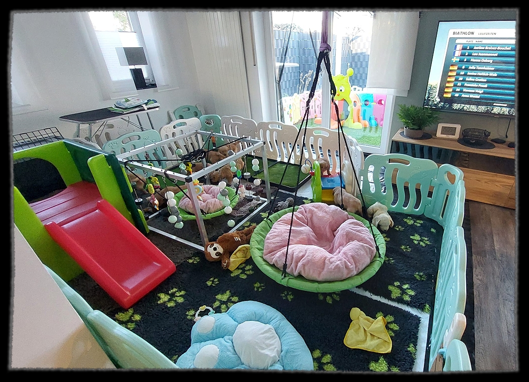 Und wieder einmal haben wir umgeräumt... Ende der 4. Lebenswoche... und ihnen ein hoffentlich angenehmes Spieleparadies errichtet...