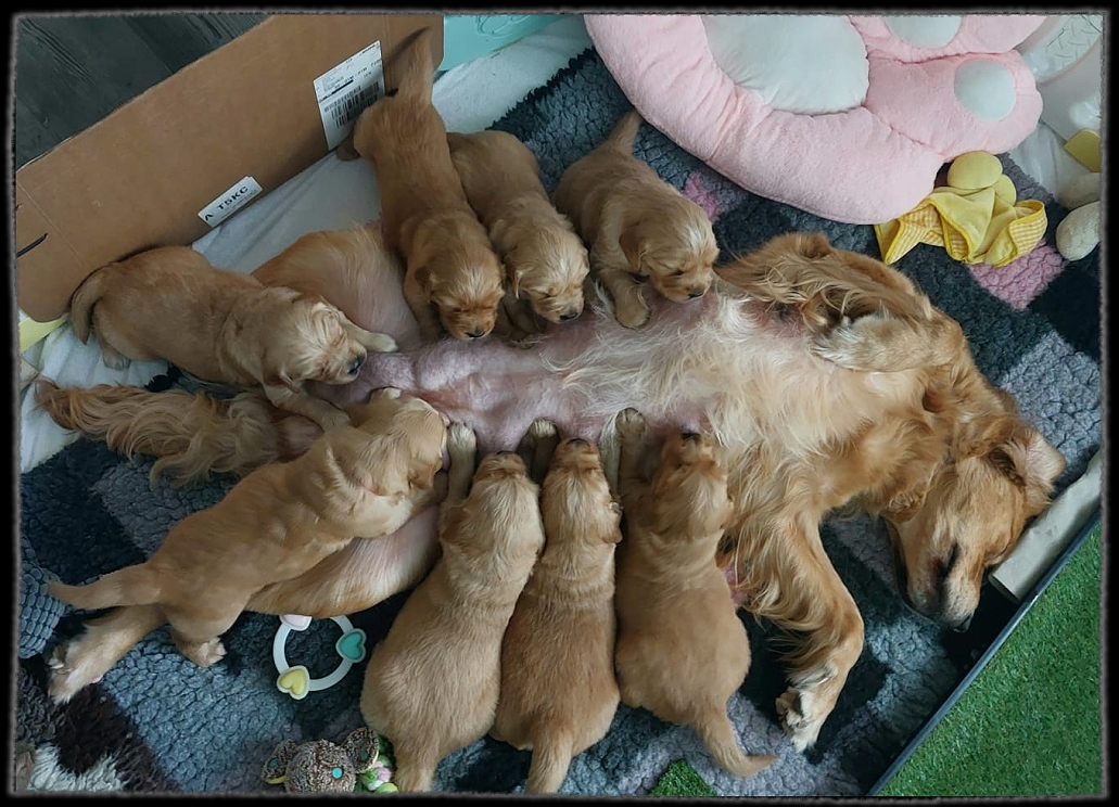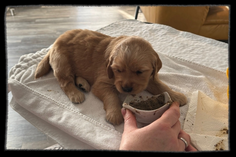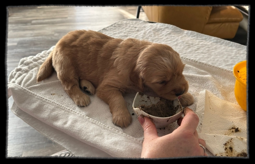 und später dann auch das eingekochte Barf Dosenfutter kennen gelernt und voll rein gehauen ;0)) Ich füttere immer jeden Welpen einzeln, damit sie nicht vor Gier so schlingen und ich auch weiß, was sie gefressen haben. Am Ende der 5. Lebenwoche bekommen sie von mir 3 Mahlzeiten und 4 bis 5 Mal Yumas Milchbar ;)